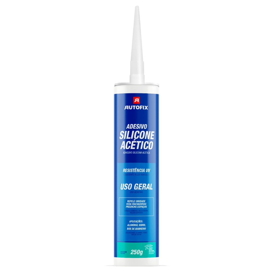É um adesivo de silicone multiuso flexível de cura acética, ideal para reparar uma grande variedade de materiais como: vidro, metais, madeira, alumínio, policarbonatos e outros. IMPORTANTE: Não indicado como selante para motores. Forma película em aproximadamente 10 minutos e cura total em 24 horas.